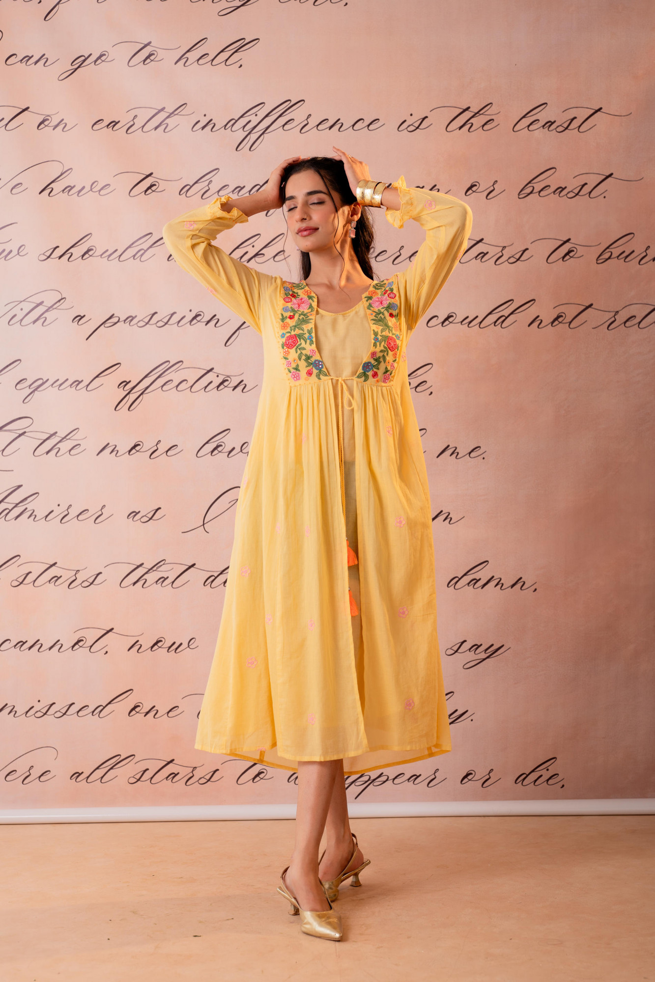 A radiant pastel yellow kurta featuring a beautifully embroidered floral neckline panel that cascades into soft gathers for an effortless, flowy silhouette. Designed with a drawstring tie-up and playful tassel accents, this piece blends festive charm with daytime elegance — perfect for sunlit celebrations and intimate gatherings.