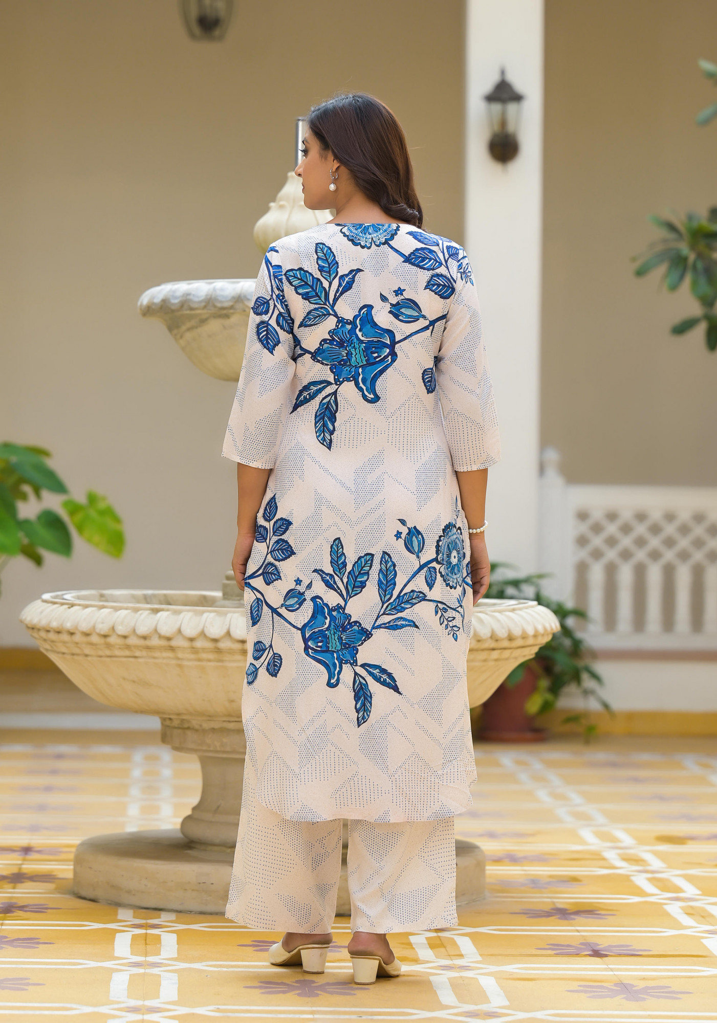 White And Blue Floral Printed Viscose Kurta And Pant Set Exudes Elegance With Its Button Closure Detail. The Knee-Length Straight Kurta Features A Round Neckline And Three-Quarter Regular Sleeves, Paired Beautifully With Matching Printed Slip-On PantsPack of Content :- 1 Kurta, 1 Pant Color :- White & Blue Top Type :- Kurta Top Pattern :- Printed Print Type :- Floral Top Fabric :- Viscose Top Design Styling :- Straight Top Hemline :- Straight Top Length :- Knee length Top Shape :- Straight Neck :- Round Neck Sleeve Length :- Three Quarter Sleeves Top Closure :- Button Closure Bottom Fabric :- Viscose Bottom Type :- Pants Ornamentation :- Button Closure