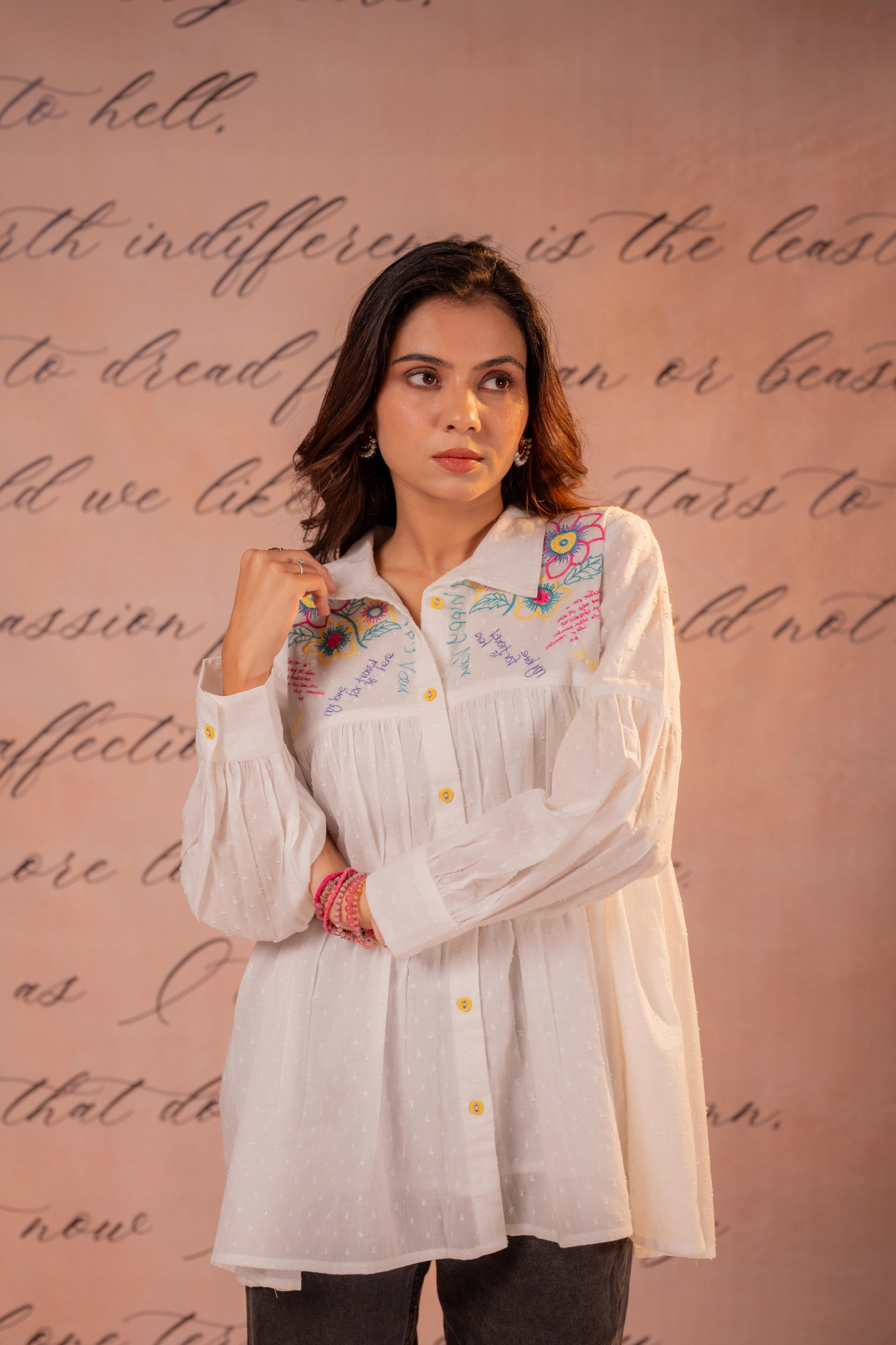 Soft and feminine, this white gathered shirt features delicate print across the yoke, adding a subtle artisanal touch. Designed with a relaxed silhouette and gentle gathers below the yoke, the shirt creates a breezy and comfortable look. The contrast buttons enhance the playful aesthetic, while the full sleeves with cuff detailing add a refined finish. Perfect for casual outings, brunch dates, and effortless everyday style.Pack of Content :- Contian:, 1 Shirt Top Type :- Shirt Top Pattern :- Printed Print/Pattern Type/Trend :- Floral Top Fabric :- Cotton Top Design Styling :- Gathered yoke shirt with relaxed silhouette Top Hemline :- Curved Top Length :- Hip length Top Shape :- A-Line Neck :- Shirt collar Sleeve Length :- Full Top Closure :- Front button closure Occasion :- Casual Ornamentation :- ButtonsFit :- Fit & Flare