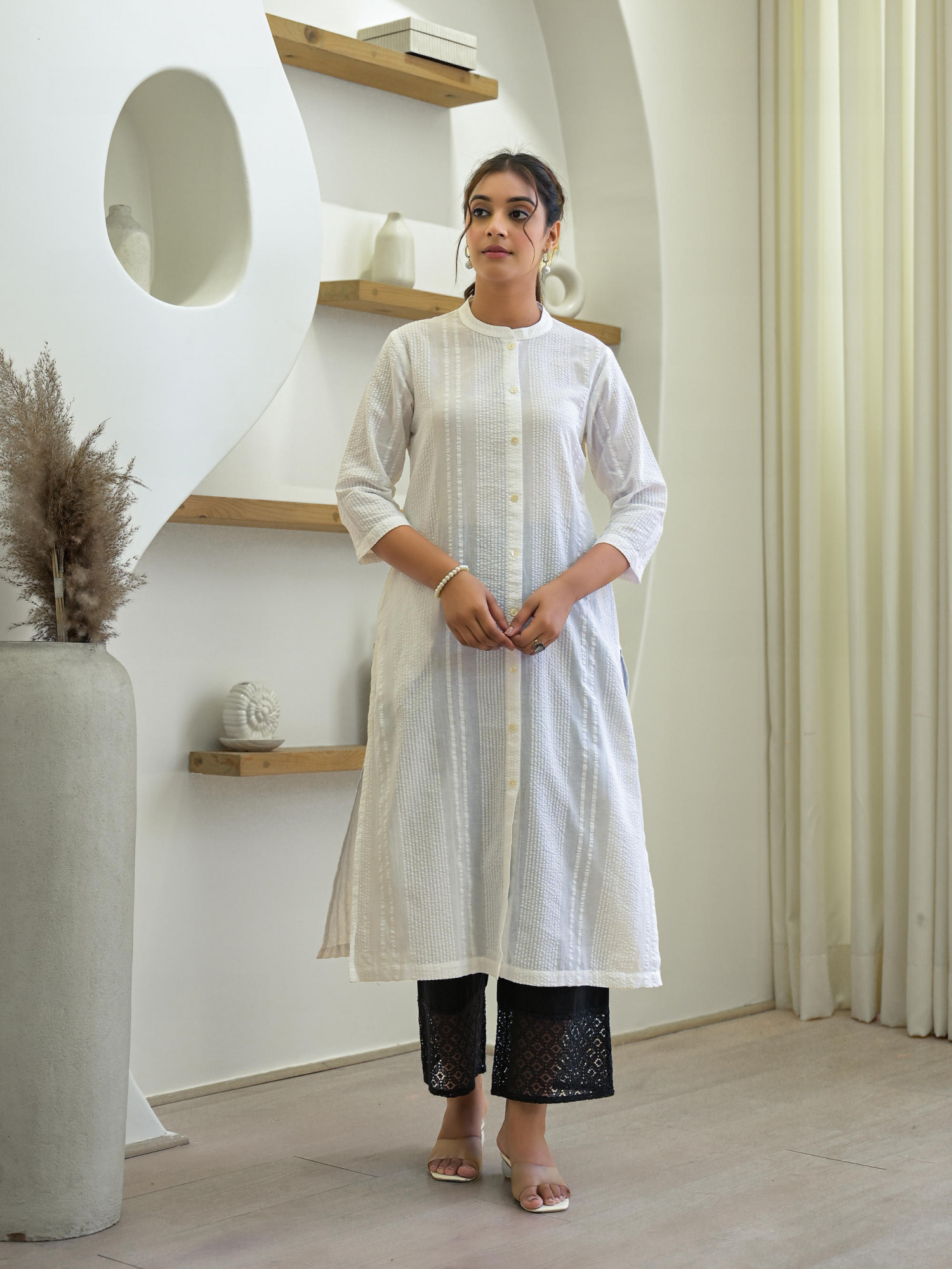 White solid cotton kurta featuring a button closure and a mandarin collar. This calf-length straight-cut kurta is designed with three-quarter regular sleeves, offering a blend of comfort and style.Pack of Content :- 1 Kurta Color :- White Top Type :- Kurta Top Pattern :- Solid Top Fabric :- Cotton Top Design Styling :- Straight Top Hemline :- Straight Top Length :- Calf length Top Shape :- Straight Neck :- Mandarin Collar Sleeve Length :- Three Quarter Sleeves Top Closure :- Button Closure Ornamentation :- Button