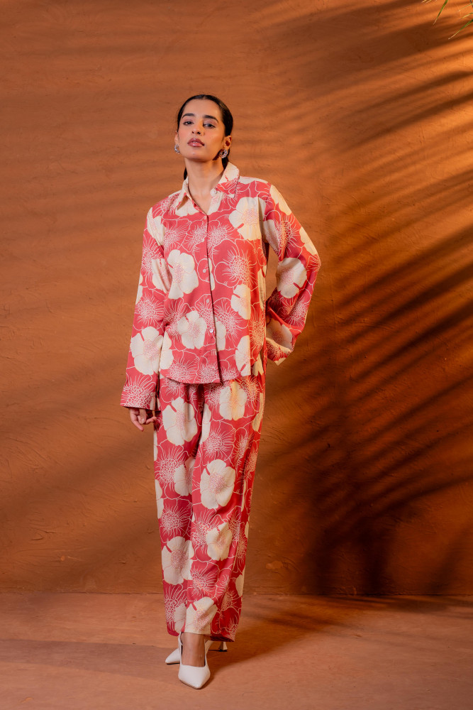 This floral print co-ord set blends comfort with effortless fashion. The shirt features a classic collar, full sleeves, and a fluid silhouette that drapes beautifully. Straight pants with a clean waistband and slip-on comfort create a perfectly coordinated look. The bold and tropical floral motifs add a refreshing, summery charm. Ideal for day outings, brunch, office-casual styling, travel wear, or home elegance.