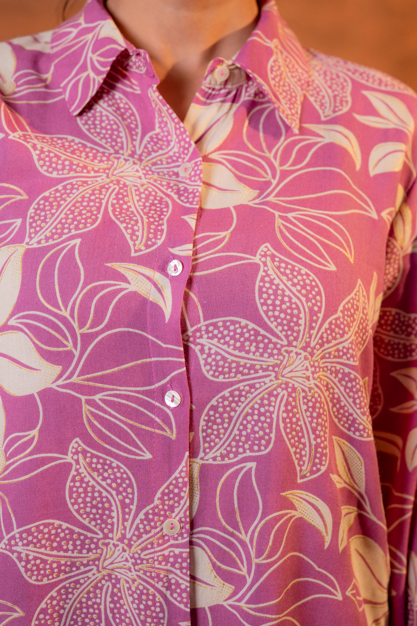 This floral print co-ord set blends comfort with effortless fashion. The shirt features a classic collar, full sleeves, and a fluid silhouette that drapes beautifully. Straight pants with a clean waistband and slip-on comfort create a perfectly coordinated look. The bold and tropical floral motifs add a refreshing, summery charm. Ideal for day outings, brunch, office-casual styling, travel wear, or home elegance.